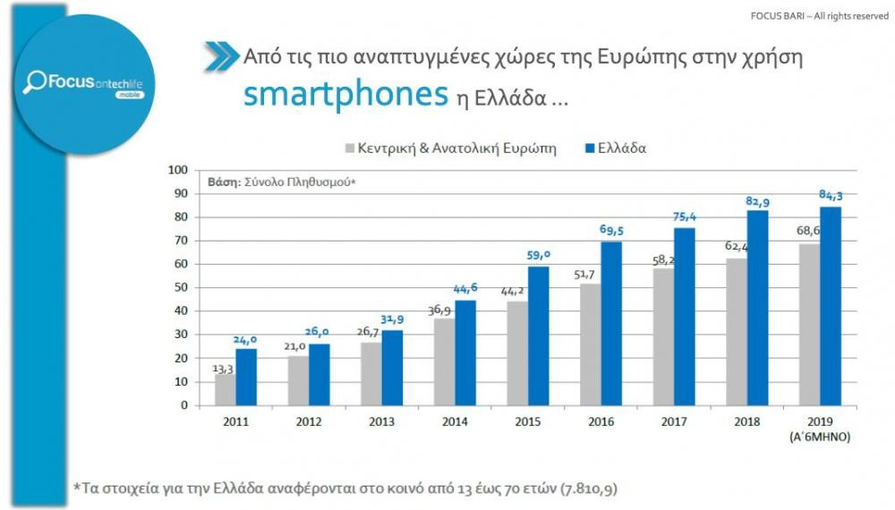 Από τις πιο αναπτυγμένες χώρες της Ευρώπης στην χρήση smartphones η Ελλάδα με καθολική χρήση από τις ηλικίες έως 44 ετών και διαρκώς αναπτυσσόμενη.