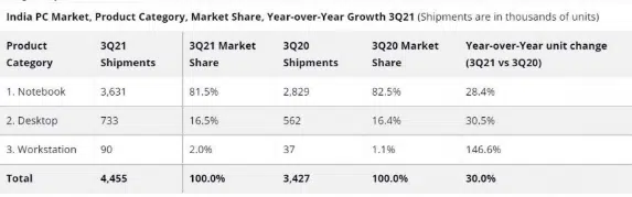 H Ινδική αγορά υπολογιστών απόλαυσε το καλύτερο τρίμηνο της ιστορίας της, με συνολικά 4,5 εκατομμύρια επιτραπέζιους υπολογιστές, φορητούς υπολογιστές και σταθμούς εργασίας που έχουν αποσταλεί. Πρόκειται για μια αύξηση 30% σε σύγκριση με το περσινό τρίτο τρίμηνο, και παρά τις συνεχιζόμενες ελλείψεις chip.