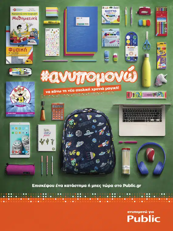 Στο Public, θα βρεις μια μεγάλη ποικιλία από σχολικές τσάντες, την έξυπνη και πρακτική υπηρεσία School Pack, πακέτα με όλα τα σχολικά βιβλία ανά τάξη, ντυμένα με προστατευτικό κάλυμμα και χιλιάδες άλλα προϊόντα.
