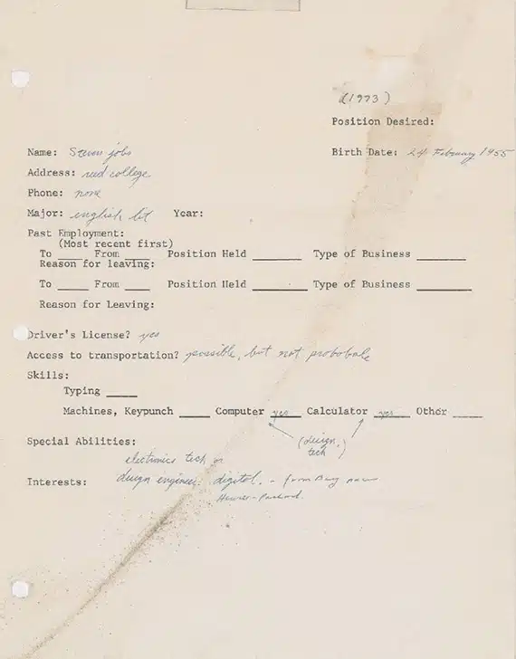 Η αίτηση αναγράφει ξεκάθαρα το όνομα του Steve Jobs ο οποίος δηλώνει φοιτητής στο Reed College, ενώ κάτω από το πεδίο που αναφέρεται σαν “ειδικές ικανότητες” αναγράφει “electronic tech or design engineer, digital, from Bay near Hewitt-Packard”, θέλοντας να δηλώσει ότι μένει στην περιοχή κοντά στην εταιρεία Hewlett-Packard. Για την ιστορία θα αναφέρουμε ότι ο Steve Jobs κατέληξε να δουλέυει στην Atari μαζί με το Steve Wozniak με την Apple να ιδρύεται το 1976.