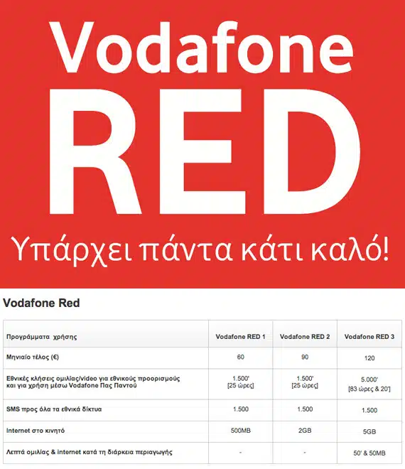 Η Vodafone παρουσιάζει τα νέα προγράμματα Vodafone RED. Για πρώτη φορά σε ένα μόνο πρόγραμμα, οι συνδρομητές έχουν απεριόριστη ομιλία και SMS προς όλα τα δίκτυα αλλά και μοναδικές υπηρεσίες που καλύπτουν κάθε ανάγκη στην επικοινωνία. Μία πρόταση που σχεδιάστηκε για να απαντήσει στις σύγχρονες απαιτήσεις τόσο των ιδιωτών όσο και των επαγγελματιών συνδρομητών της.