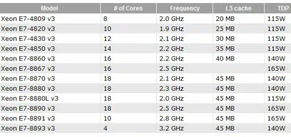 Όπως φαίνεται και στον πίνακα η σειρά Xeon E7-4800 v3 επεξεργαστών θα αποτελείται από τους E7-4809, E7-4820, E7-4830 και Ε7-4850 διαθέτοντας 8, 10, 12 και 14 πυρήνες αντιστοίχως. Κάθε επεξεργαστής, επίσης αντίστοιχα, διαθέτει 20, 25, 30 και 35 MB shared L3 cache μνήμης. Όλοι οι επεξεργαστές είναι περιορισμένοι στο σύστημα ΤDP κατανάλωσης 115 Watt και θα εκκινούν από τα 1,9 GHz και θα φτάνουν τα 2,2 GHz ανάλογα το μοντέλο επεξεργαστή.