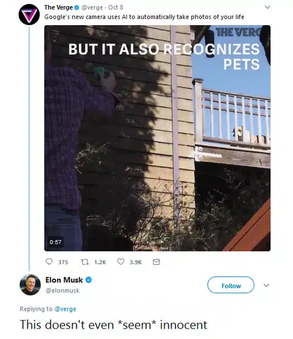 Την κάμερα Google Clips, η οποία χρησιμοποιεί τεχνητή νοημοσύνη, σχολίασε ο Elon Musk, αναφέροντας ότι δεν μοιάζει καν αθώα.