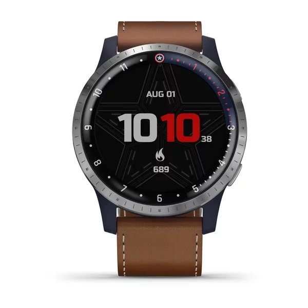 Ακολουθώντας την ίδια λογική, το Garmin First Avenger έχει τα ίδια χαρακτηριστικά με το Vivoactive 4, δερμάτινο λουράκι και μπλε κάσα με ατσάλινο στεφάνι. Επιπλέον, στην κορυφή του γυαλιού υπάρχει τυπωμένη η ασπίδα του πρώτου εκδικητή και στο πίσω μέρος έχουν χαραχθεί οι λέξεις “I CAN DO THIS ALL DAY”.
