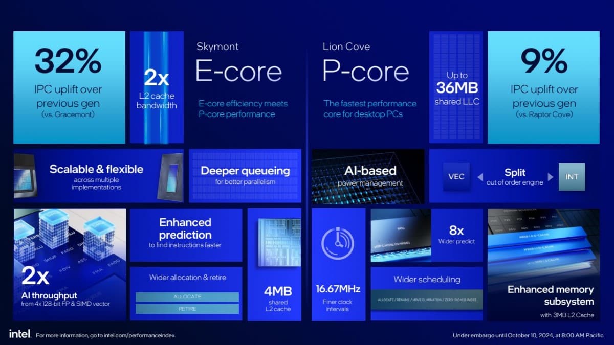 Η Intel υποστηρίζει βελτίωση 9% στο IPC για τους πυρήνες P σε σύγκριση με την 14η γενιά, 32% βελτίωση στην IPC για τους E-cores, κάτι που η εταιρεία ισχυρίζεται ότι έχει ως αποτέλεσμα έως και 13% βελτίωση στην απόδοση multi-thread σε σύγκριση με τον ανταγωνισμό.