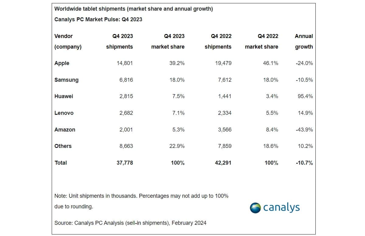 Σε σύγκριση με το 4ο τρίμηνο του 2022, μόνο η Huawei και η Lenovo σημείωσαν ανάπτυξη – ένα τεράστιο 95,4% για την πρώτη και 14,9% για τη δεύτερη. Οι πωλήσεις της Apple μειώθηκαν κατά 24%, της Samsung κατά 10% και της Amazon κατά 43,9%. Η συνολική αγορά tablet το τέταρτο τρίμηνο σημείωσε πτώση 11% στις πωλήσεις στα 37,8 εκατομμύρια μονάδες.