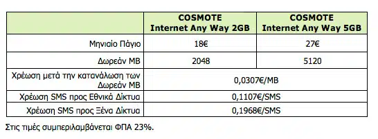 Τα προγράμματα COSMOTE Internet Any Way, που μόνο η COSMOTE προσφέρει, αλλάζουν τα δεδομένα προσφέροντας ακόμη μεγαλύτερη ευελιξία και ευκολία για το σερφάρισμα στο Internet. Το Mobile Internet προσαρμόζεται στις ανάγκες του καθενός, για να μπορεί να απολαμβάνει γρήγορο σερφάρισμα στο Internet με τη σιγουριά του προηγμένου 3G δικτύου της COSMOTE.