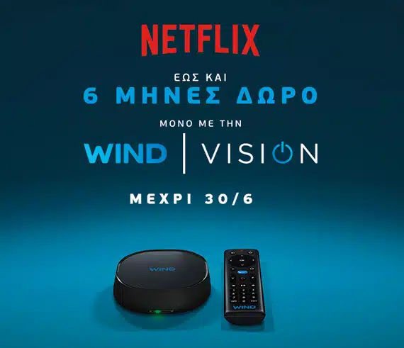 Για λίγες ακόμα ημέρες θα μπορούν να έχουν έως και 6 μήνες δωρεάν συνδρομή NETFLIX όσοι κάνουν αίτηση για να αποκτήσουν τη συνδρομητική υπηρεσία τηλεόρασης WIND VISION. Η προσφορά είναι διαθέσιμη μέχρι και το Σάββατο 30 Ιουνίου τόσο από τα καταστήματα WIND σε όλη την Ελλάδα όσο και ηλεκτρονικά.
