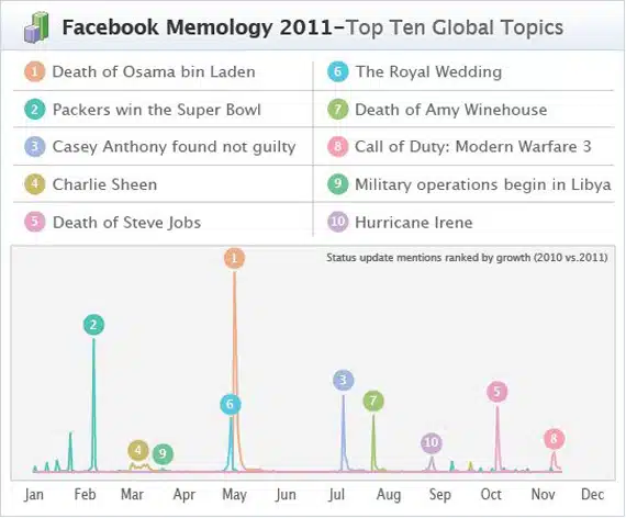 Κάθε χρόνο εκατομύρια χρήστες του Facebook δημοσιεύουν στο προφίλ τους σημαντικές για αυτούς πληροφορίες και γεγονότα, σχολιάζοντας την επικαιρότητα και άλλα θέματα. Το Facebook Memology πιάνει το σφυγμό του 2011 και παρουσιάζει τα 10 πιο δημοφιλή θέματα (topics) που σχολιάστηκαν και συζητήθηκαν μέσα από τα status των χρηστών ανα μήνα τη χρονιά που φεύγει.