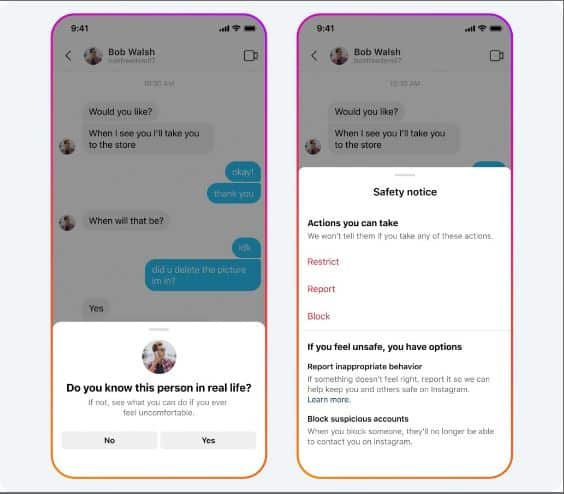 Όταν οι έφηβοι αρχίσουν να στέλνουν μηνύματα σε ενήλικες, θα εμφανιστεί ένα μήνυμα στην οθόνη τους που θα τους ρωτήσει αν γνωρίζουν το άτομο στην πραγματική ζωή. Στη συνέχεια, θα υπάρχει μια σημείωση ασφαλείας, η οποία περιλαμβάνει επιλογές δράσης προκειμένου να αποτραπεί περαιτέρω επαφή με αυτό το άτομο.