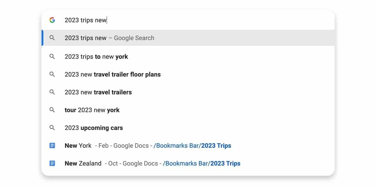 Στη συνέχεια, μπορείτε πλέον να κάνετε αναζήτηση στους φακέλους των σελιδοδεικτών σας απευθείας από τη γραμμή διευθύνσεων, σε επιτραπέζιους υπολογιστές και κινητά. Απλώς πρέπει να συμπεριλάβετε το όνομα του φακέλου στην αναζήτηση και θα λάβετε προτάσεις από αυτήν τη συλλογή.