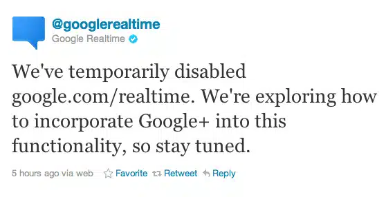 Εδώ και δύο χρόνια η Google παρείχε την υπηρεσία Realtime όπου μπορούσαμε να ψάξουμε τα τελευταία νέα, άρθρα, social updates και blogs σχετικά με σημαντικά θέματα που λάμβαναν χώρα σε πραγματικό χρόνο σε όλο τον κόσμο. Σήμερα λοιπόν, η Google μέσα από ένα tweet, ανακοίνωσε πως η υπηρεσία Realtime απενεργοποιείται προσωρινά με σκοπό να βρεθεί τρόπος να ενσωματωθεί στο Google+.