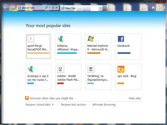 Όπως περιμέναμε λοιπόν βρήκαμε στον IE 9, τα tabs να βρίσκονται στην κορυφή της σελίδας πλέον και όχι κάτω από το url, είδαμε την γνωστή αρχική οθόνη του Safari ή των Chrome (Chrome 10 η πιο πρόσφατη έκδοση) και Opera αργότερα με τις προτεινόμενες αγαπημένες μας σελίδες σε preview κουτάκια και είδαμε επίσης το μενού να έχει μετατραπεί σε τρία μικρά εικονίδια στο δεξί μέρος της οθόνης (βλ. Chrome).