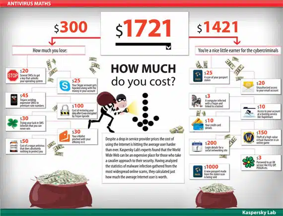 H Kaspersky ανέλυσε τα στατιστικά στοιχεία που έχει συγκεντρώσει από επιθέσεις malware και έβγαλε ενα μέσο όρο αξίας του σημερινού χρήστη του ίντερνετ. Μάθε τι κόστος έχεις αν υποκλαπούν τα στοιχεία σου και πόσο αξίζουν αυτές οι πληροφορίες αν τις πουλήσει αυτός που στις έκλεψε. Απλά μαθηματικά! Κάντε κλικ πάνω στην εικόνα για μεγέθυνση.