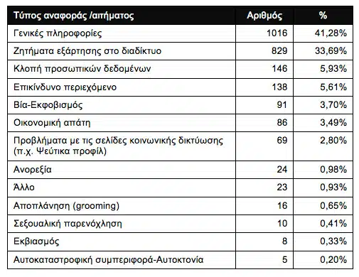 Από αυτά 2.159 αιτήματα έγιναν μέσω τηλεφωνικών κλήσεων στον αριθμό χωρίς χρέωση 800.11.800.15 (87,73%) και 302 μέσω ηλεκτρονικού ταχυδρομείου στη διεύθυνση help@saferinternet.gr (12,27%). Τα πιο σημαντικά αποτελέσματα της στατιστικής ανάλυσης είναι τα εξής: