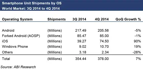 Σύμφωνα με την εταιρεία αναλυτών ABI Research οι παγκόσμιες αποστολές (shipments) Android smartphones μειώθηκαν 5% στο 4ο τρίμηνο συγκριτικά με του 3ου τριμήνου. Συγκεκριμένα στο 4ο τρίμηνο συνολικά στάλθηκαν 205,56 εκ συσκευές ενώ το 3ο 217,49εκ, κάτι αρκετά απογοητευτικό για την εταιρία καθώς το τελευταίο τρίμηνο θεωρείται αυτό των διακοπών και μεγάλης ζήτησης της αγοράς.