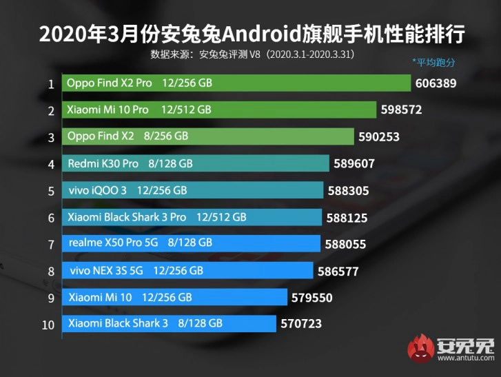Η δημοφιλής πλατφόρμα AnTuTu έδωσε στην δημοσιότητα τα charts με τα Top 10 Android smartphones που σκοράρουν πρώτα τον Μάρτιο του 2020. Το AnTuTu παρέχει δωρεάν εργαλεία (εφαρμογή) όπου οι κάτοχοι smartphones μπορούν να μετρήσουν επιμέρους χαρακτηριστικά των συσκευών τους μέσα από τεστ που ελέγχουν μεταξύ άλλων την ισχύ συστημάτων όπως ο επεξεργαστής, η μνήμη RAM και η ταχύτητα εγγραφής στην ενσωματωμένη μνήμη.