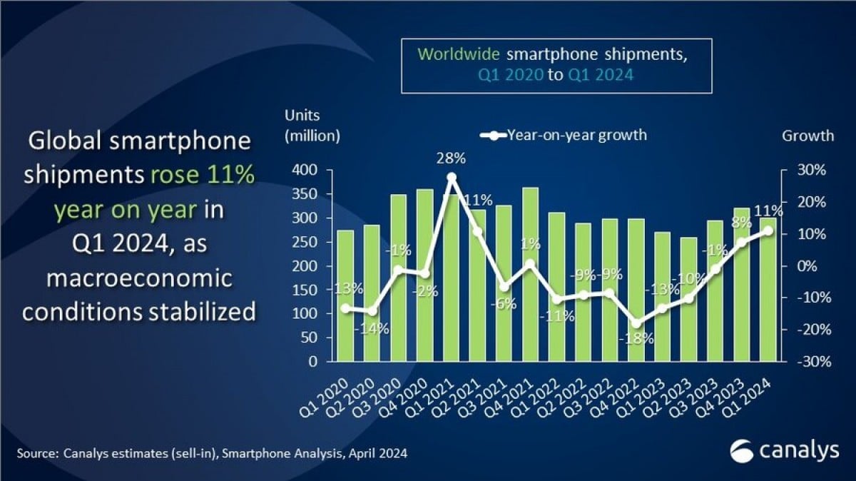 Οι παγκόσμιες αποστολές smartphone αυξήθηκαν κατά 11% το 1ο τρίμηνο του 2024, σύμφωνα με την τελευταία έκθεση της Canalys. Η καταναλωτική ζήτηση φέρεται να έχει αυξηθεί δυναμικά χάρη στο ευνοϊκότερο οικονομικό κλίμα.