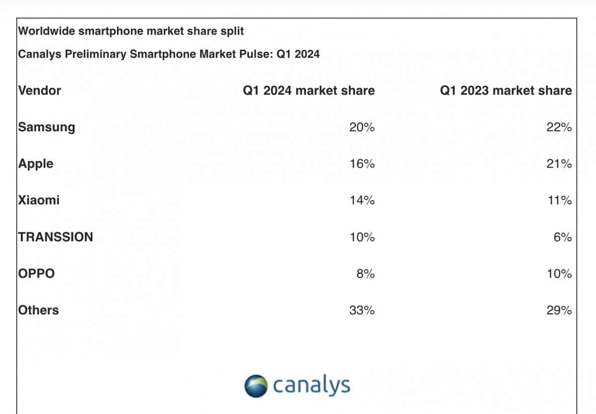 Η Samsung ανέκτησε την πρώτη θέση με εκτιμώμενο μερίδιο αγοράς 20% που υποστηρίζεται από την ισχυρή ζήτηση για τη σειρά Galaxy S24 και το Galaxy AI που κυκλοφόρησε. Η Apple ήρθε στη δεύτερη θέση με μερίδιο 16% της αγοράς με κάποια πτώση στη ζήτηση για το iPhone της μετά από ένα ισχυρό τέταρτο τρίμηνο όπου η εταιρεία ήταν στην κορυφή των charts. Η Xiaomi συμπλήρωσε την πρώτη τριάδα με μερίδιο αγοράς 14% χάρη στη σταθερή ζήτηση για τη σειρά Redmi της στην αρχική κατηγορία.
