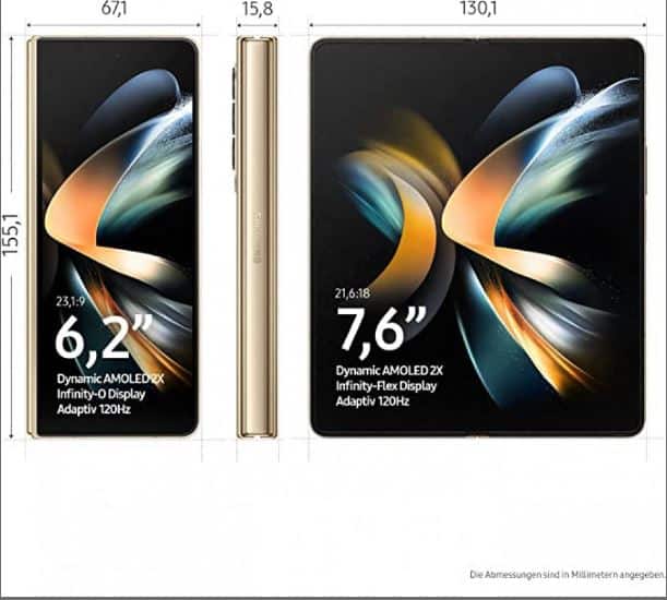 Η εξωτερική οθόνη έχει διαγώνιο 6,2 ιντσών, με ρυθμό ανανέωσης 120 Hz και κεντρική οπή διάτρησης για την κάμερα selfie. Η foldable εσωτερική οθόνη έχει διαγώνιο 7,6 ιντσών και επίσης στα 120 Hz. Οι διαστάσεις, λοιπόν, είναι ίδιες με πέρυσι με πιο ευρύ aspect ratio. Η εξωτερική είναι 23,1:9 ενώ η foldable 21,6:18. Διπλωμένη η συσκευή έχει πάχος 15,8 mm, ελαφρώς βελτιωμένο δηλαδή από το προηγούμενο.