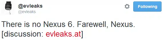 Ο γνωστός μας @evleaks όμως που συνήθως μεταδίδει έγκυρες πληροφορίες, με tweets του μας λέει ότι η Google δεν θα κυκλοφορήσει τελικά το Nexus 6 αλλά επιβεβαιώνει τις πληροφορίες για τη σειρά Android Silver. Επομένως αν κάτι τέτοιο ισχύει το Google Nexus 5 είναι η τελευταία συσκευή που κυκλοφόρησε η Google.