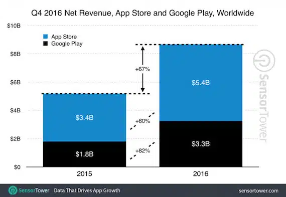 Σύμφωνα με την εταιρεία ερευνών SensorTower, τα έσοδα του App Store της Apple έφτασαν για το τέταρτο τρίμηνο του 2016 τα 5.4 δισεκατομμύρια, σημειώνοντας 60% αύξησε σε σχέση με πέρσι, την ίδια περίοδο. Η αύξηση των εσόδων στο ίδιο διάστημα, ήταν ακόμα μεγαλύτερη για το Play Store της Google, το οποίο σημείωσε έσοδα 3.3 δισεκατομμυρίων, 82% αυξημένα σε σχέση με το 2015.