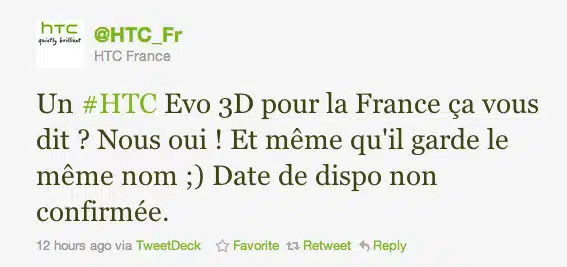 Νέες πληροφορίες καταφθάνουν για την κυκλοφορία του HTC EVO 3D στην Ευρωπαϊκή αγορά (HTC Desire 3D;). Αυτή τη φορά μέσα από το επίσημο προφιλ της HTC Γαλλίας στο Twitter. Σύμφωνα πρόσφατο tweet η εταιρεία επιβεβαιώνει την έλευση του Desire 3D χωρίς να διευκρινίζει την ακριβή ημερομηνία. Το HTC Desire 3D θα βρεθεί αντιμέτωπο με το επίσης 3D smartphoneLG Optimus 3D.