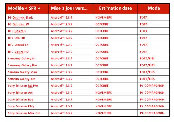 Η γαλλική εταιρεία κινητής τηλεφωνίας SFR δημοσίευσε ένα πίνακα με τις επικείμενες αναβαθμίσεις των branded κινητών της. Μέσα από εκεί προκύπτουν δύο ενδιαφέρουσες ειδήσεις για τις αναβαθμίσεις σε Android 2.3 Gingerbread. Το LG Optimus 2X θα αναβαθμιστεί μέσα στο μήνα και το LG Optimus Black το Νοέμβριο.