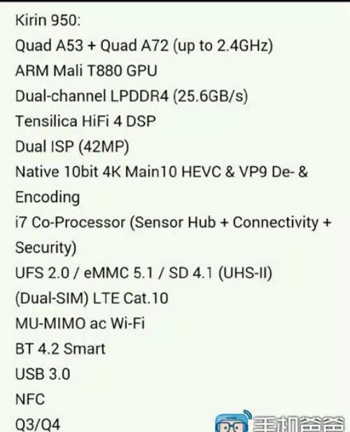 Φαίνεται ότι μιλάμε για 64-bit οκταπύρηνο chipset με 4 πυρήνες Cortex-A53 και άλλους 4 Cortex-A72. Ο Kirin 950 θα μπορεί να χρονιστεί έως και τα 2.4GHz ενώ η ARM Mali T880 θα είναι υπεύθυνη για τα γραφικά.