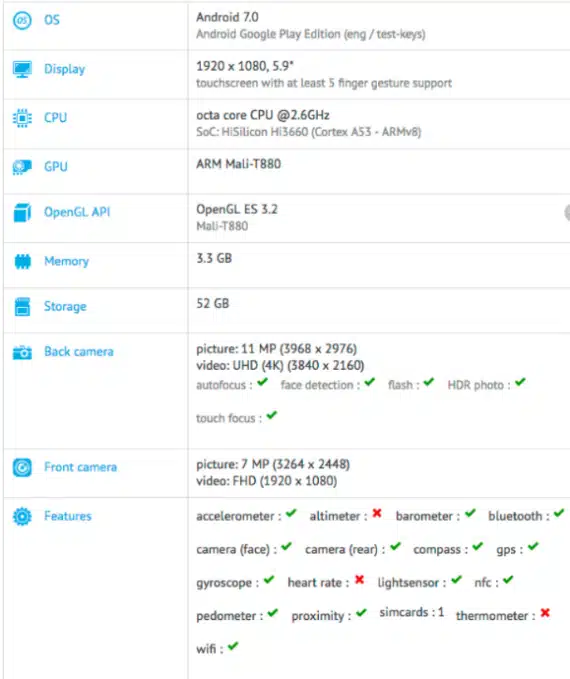 Το Huawei Mate 9 φαίνεται πως πέρασε από το τη βάση δεδομένων του GFX Bench, το οποίο μας αποκαλύπτει τα τεχνικά χαρακτηριστικά. Εμφανίζεται με οθόνη 5.9 ιντσών ανάλυσης 1080×1920 pixels, οκταπύρηνο επεξεργαστή 2.6GHz, Mali-T880 GPU, μνήμη RAM 4GB, ενσωματωμένη μνήμη 64GB. Η κάμερα στην πλάτη είναι 12 Megapixel, η εμπρόσθια κάμερα 8 Megapixel και τρέχει Android 7.0 Nougat.