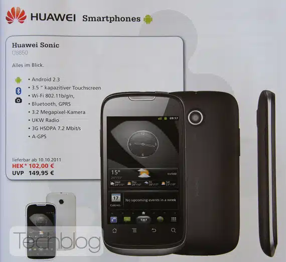 Στον κατάλογο που το βρήκαμε η τιμή του με τους φόρους είναι 149.95 ευρώ όμως όταν κυκλοφορήσει (ημερομηνία 10 Οκτωβρίου 2011, δεν σημαίνει ότι τότε θα κυκλοφορήσει και στη χώρα μας) αυτή μπορεί να είναι και πιο χαμηλή και εξηγούμαι. Στον ίδιο κατάλογο το Huawei X5 το δίνει 249.95 ευρώ, ενώ Ελλάδα κυκλοφόρησε στα 199 ευρώ!