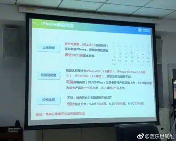 Η συγκεκριμένη φωτογραφία εμφανίστηκε στο Weibo από το Ιαπωνικό blog MacOtakara, και αποτελεί μια εσωτερική παρουσίαση του παρόχου κινητής τηλεφωνίας στην Κίνα, China Mobile, για τα νέα iPhone, όπου φαίνεται να παρουσιάζονται τα ονόματα των συσκευών αλλά και οι τιμές τους, καθώς και μερικές ακόμα λεπτομέρειες σχετικά με τα μοντέλα που θα εμφανιστούν και σε έκδοση με δύο κάρτες sim.