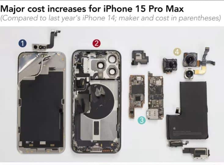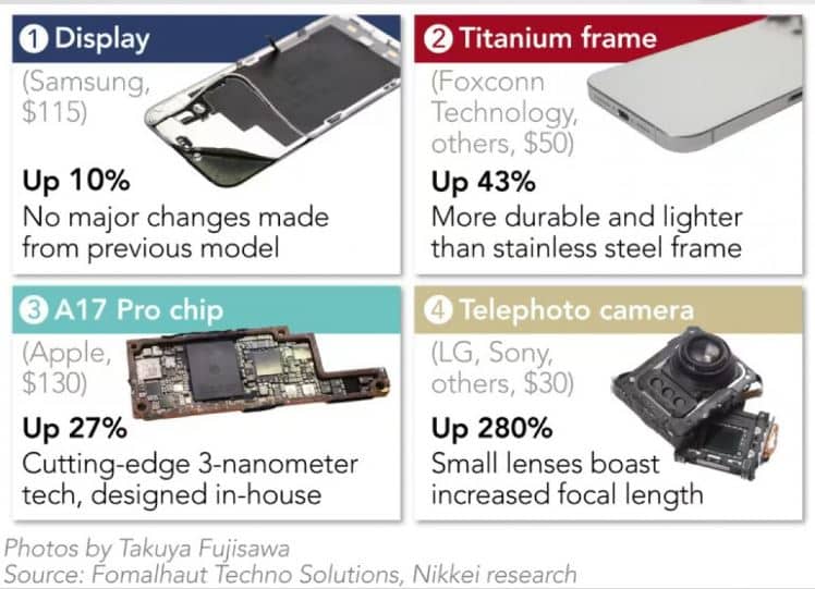Επιπλέον, το πλαίσιο από τιτάνιο στο 15 Pro Max εκτιμάται ότι κοστίζει 50 $, ποσό αυξημένο κατά 43% σε σύγκριση με το πλαίσιο από ανοξείδωτο χάλυβα στο περσινό μοντέλο. Το νέο chipset A17 Pro εκτιμάται ότι κοστίζει 130 $ ενώ η οθόνη κοστίζει 115 $, αυξήσεις της τάξεως του 27% και 10% αντίστοιχα.
