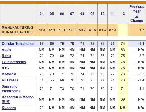 Ένα σημαντικό συμπέρασμα του δείκτη αποτελεί το γεγονός ότι είναι πλέον εμφανές ότι έχει αλλάξει αυτό που ζητούν οι καταναλωτές από τη συσκευή τους, με το iPhone να καταφέρνει επίδοση ρεκόρ, ενώ οι συσκευές της RIM (τα επαγγελματικά BlackBerry) να πιάνουν το όχι και τόσο ικανοποιητικό 69.