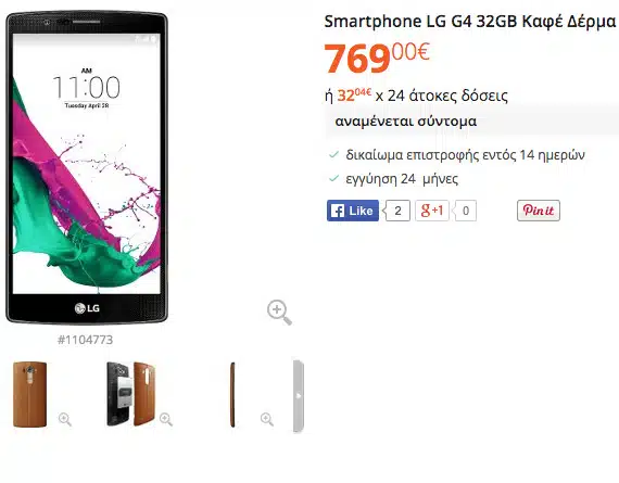 Λύθηκε το μυστήριο με την τιμή του LG G4 στην Ελλάδα και επίσημα ο συνήθης leaker – τα καταστήματα Public – το έχουν ανεβάσει στο ηλεκτρονικό κατάστημα με τιμή 769 ευρώ για την δερμάτινη έκδοση σε καφέ και μαύρο χρώμα. Θα υπάρξουν και χρωματιστές εκδόσεις με πλαστικό καπάκι για τις οποίες όμως δεν έχουμε ακόμα τιμή.