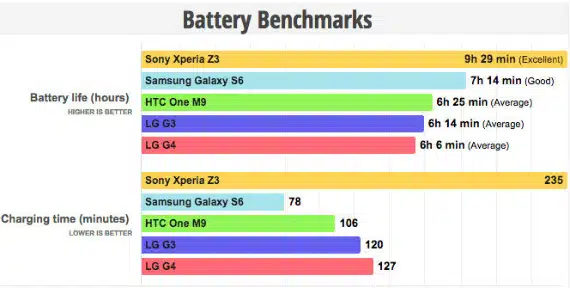 Όσο για την διάρκεια της φόρτισης το LG G4 χρειάζεται λίγο περισσότερο από 2 ώρες, το πιο γρήγορο είναι το Samsung Galaxy S6 που φορτίζει πλήρως στα 78 λεπτά, ακολουθεί το HTC One M9 στα 106 λεπτά ενώ αυτό που χρειάζεται τον περισσότερο χρόνο είναι το Sony Xperia Z3.