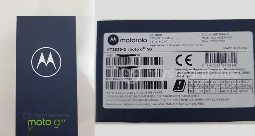 Οι live φωτογραφίες δείχνουν το G53 με αριθμό μοντέλου XT2335-2 με μπλε πλάτη και μνήμη 4/128 GB. Αυτή η έκδοση προφανώς προορίζεται για την ευρωπαϊκή αγορά με δυνατότητες διπλής SIM και υποδοχή eSIM, η οποία μπορεί να είναι η πρώτη για ένα smartphone Motorola G.
