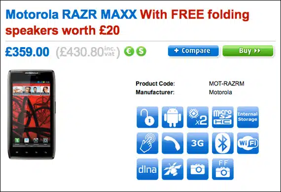 Το αγγλικό ηλεκτρονικό κατάστημα Clove που μας κάνει τη χάρη αρκετά συχνά να δημοσιοποιεί πρώτες ενδεικτικές τιμές για αναμενόμενα μοντέλα smartphones μας κάνει σήμερα γνωστό ότι το Motorola RAZR MAXX με την μπαταρία 3300mAh(!) θα κοστίζει 430 λίρες Αγγλίας (522 ευρω). Στην τιμή αυτή το Clove δίνει και δώρο ακουστικά αλλά αυτό είναι άσχετο με […]