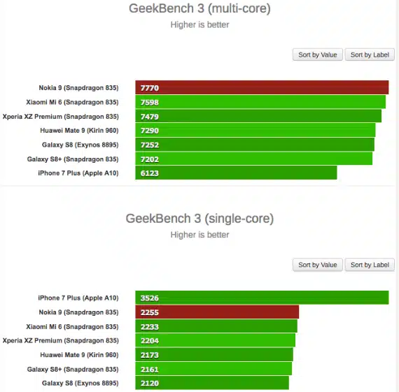 Σε single-core τεστ το iPhone 7 Plus παίρνει την πρωτιά με διαφορά και το Nokia 9 είναι στην δεύτερη θέση με 2255 πόντους.