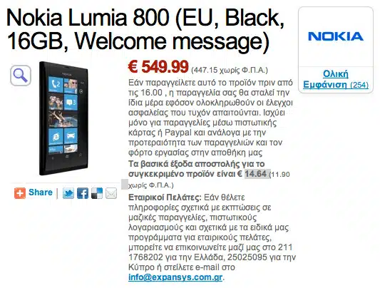 Όσοι δεν μπορείτε να περιμένετε μέχρι τον Ιανουάριο που αναμένεται να κυκλοφορήσει επίσημα στη χώρα μας το Nokia Lumia 800 με λειτουργικό σύστημα Windows Phone Mango, το ηλεκτρονικό κατάστημα Expansys το διαθέτει με 550 ευρώ (συν μεταφορικά 14.64 ευρώ). Συγκεκριμένα πρόκειται για μοντέλο της T-Mobile (SIM free, GSM, λειτουργεί Ελλάδα) σε μαύρο χρώμα. Σε σημείωση […]