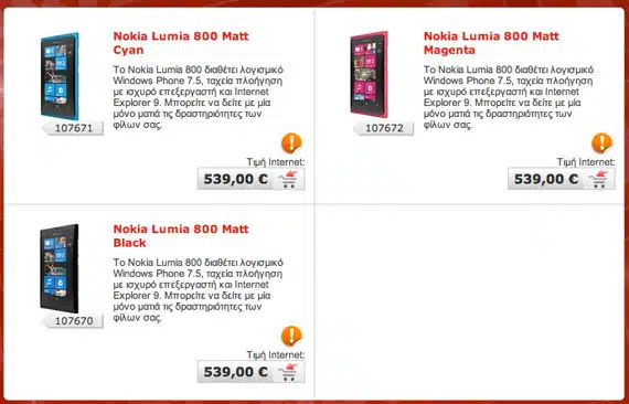 To Nokia Lumia 800 αναμένεται να κυκλοφορήσει στη χώρα μας μέσα στον Ιανουάριο και μπορεί τις προηγούμενες ημέρες να είχατε την ευκαιρία να το δείτε στα καταστήματα της Vodafone όμως από ότι μαθαίνουμε δεν θα υπάρχει κάποιου είδους αποκλειστικότητα. Σήμερα το συναντήσαμε στο ηλεκτρονικό κατάστημα του Κωτσόβολου για προπαραγγελία με 539 ευρώ και για τα τρία χρώματα.