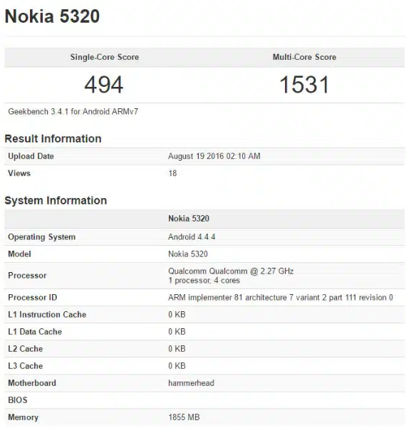 Δυο μη ανακοινωμένα smartphones της Nokia φαίνεται πως εμφανίστηκαν στο Geekbench. Το ένα είναι το Nokia 5320 με τετραπύρηνο επεξεργαστή 2.27GHz και μνήμη RAM 2GB. Ο επεξεργαστής φαίνεται να ανήκει στην high-end κατηγορία, αλλά η μνήμη RAM είναι πολύ λίγη, ενώ τρέχει την πολύ παλιά έκδοση του Αndroid 4.4.4.