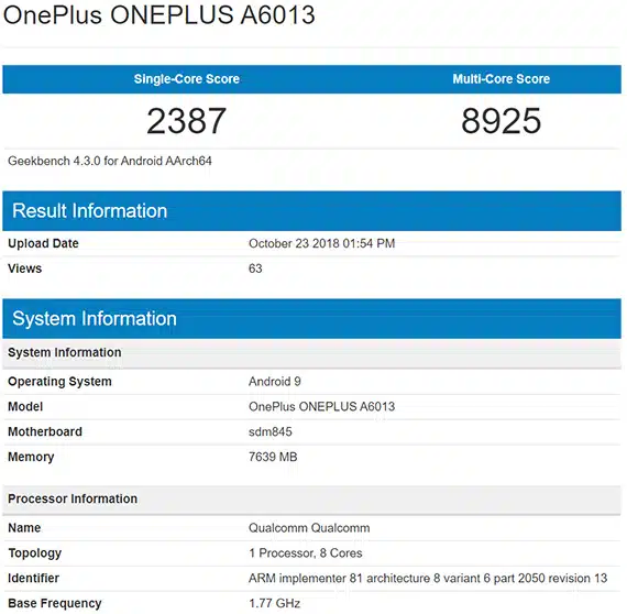 Το νέο smartphone της OnePlus πέτυχε 2387 πόντους στο single-core και 8925 πόντους στο multi-core test, τη στιγμή που το προηγούμενο μοντέλο πετυχαίνει 2408 και 8883 πόντους, δείχνοντας πως όταν το OnePlus 6T κυκλοφορήσει και επίσημα η τελική έκδοσή του, δεν αποκλείεται οι επιδόσεις του να ξεπεράσουν αυτές του προηγούμενου μοντέλου.