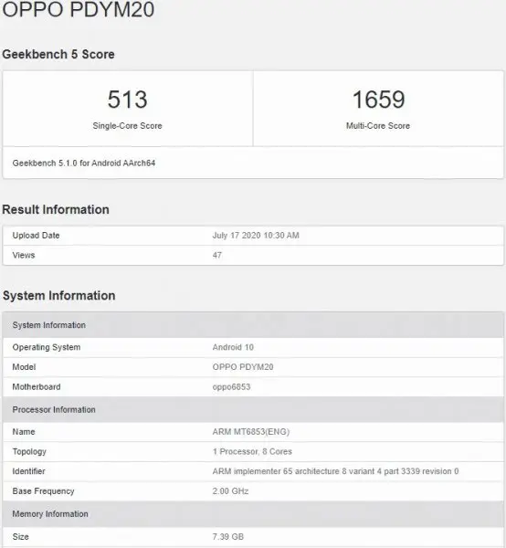 Εκτός των παραπάνω, η συσκευή πέρασε και από το Geekbench. Το Oppo A72 5G αναμένεται να κυκλοφορήσει με 8GB μνήμης RAM και τον οκταπύρηνο επεξεργαστή MediaTek 720, ο οποίος προσφέρει υποστήριξη δικτύων 5G. Η συσκευή κατάφερε να πετύχει 513 πόντους στο single-core και 1.659 πόντους στο multi-core, οπότε αναμένουμε να είναι αρκετά συσκευή.