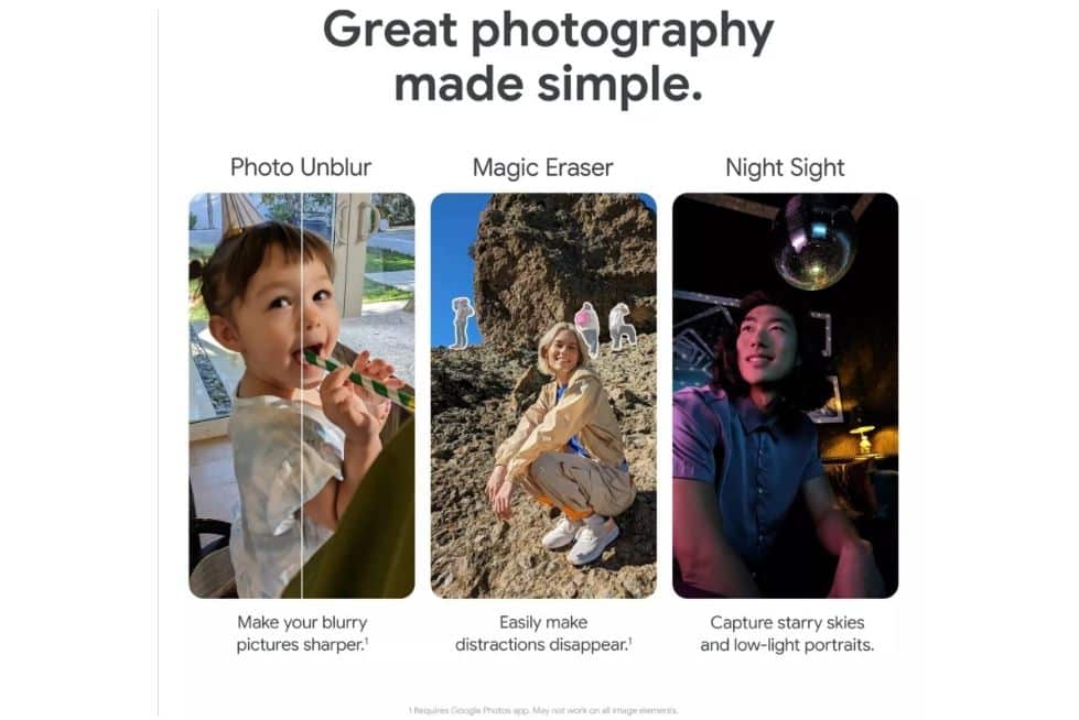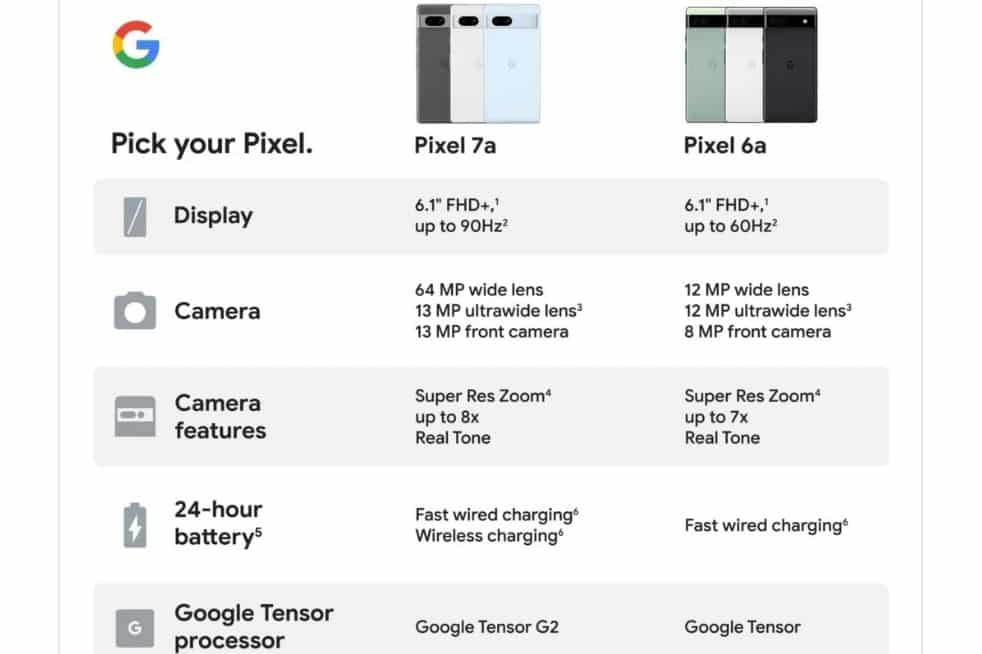 Σε σύγκριση με το Pixel 7, η οθόνη 6,1″ είναι ελαφρώς μικρότερη από την οθόνη 6,3″ του κορυφαίου μοντέλου, αλλά και οι δύο διαθέτουν οθόνες AMOLED FHD+ 90Hz. Έχει επίσης μια κύρια κάμερα υψηλής ανάλυσης για βελτιωμένο Super Res Zoom (θα είναι μια Sony IMX787 1/1,37″ με ανάλυση 64MP, αν επιβεβαιωθούν οι φήμες), καθώς και ασύρματη φόρτιση.