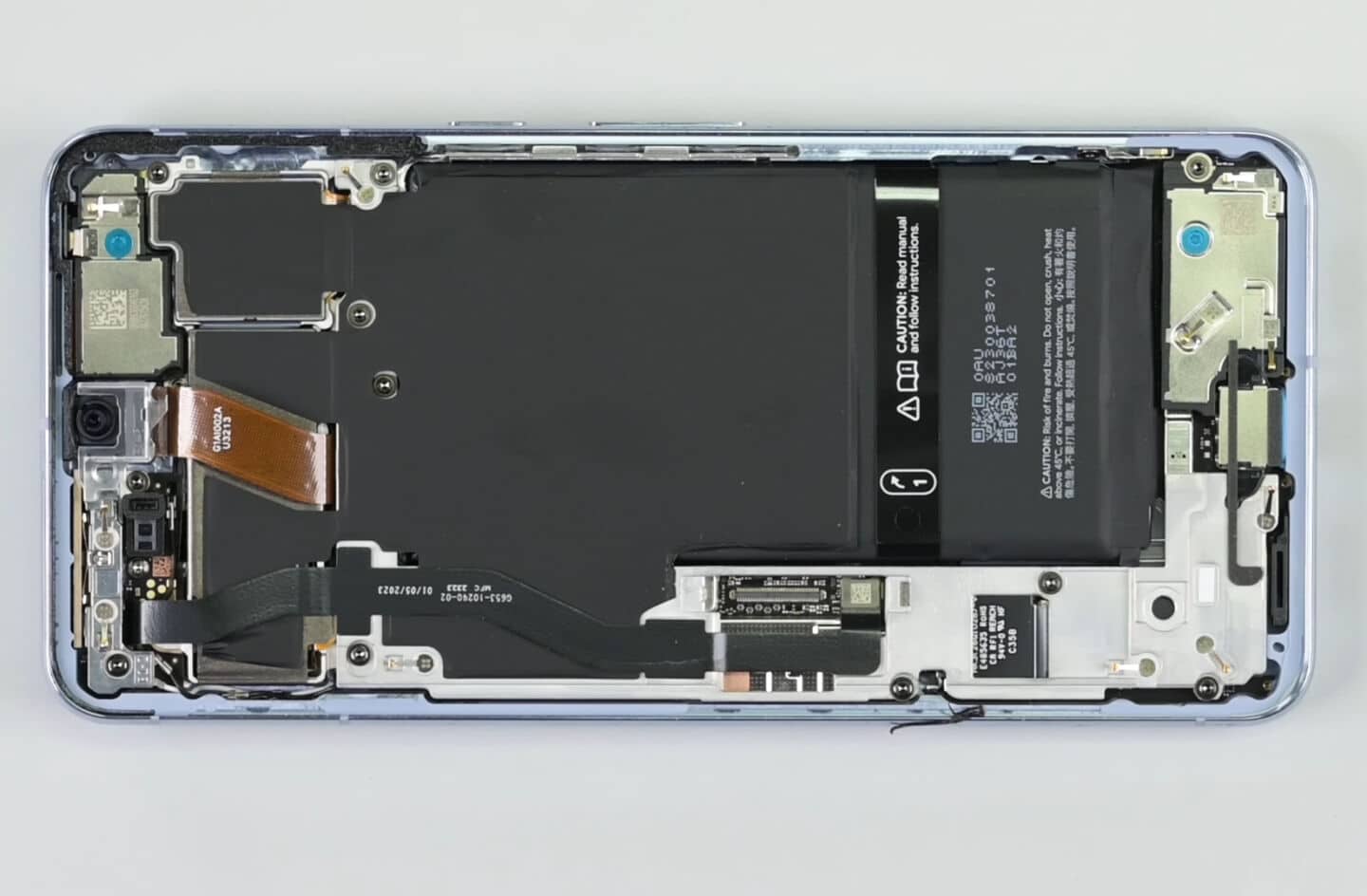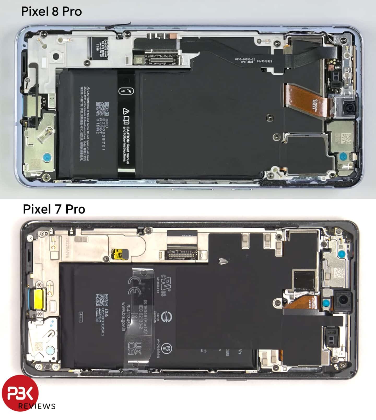 Στο εσωτερικό τα πράγματα μοιάζουν πολύ με το Pixel 7 Pro αλλά φαίνεται πως η Google ακολουθεί την Apple στην τάση της να θέλει να το κάνει να μοιάζει όμορφο. Φέτος, η μπαταρία φέρει καθαρά την επωνυμία “Google”, ενώ πέρυσι καλύπτονταν μόνο από πληροφορίες και προειδοποιήσεις κατασκευαστή. Αυτή η αποκάλυψη ήρθε αφότου η ομάδα ξεκόλλησε το cooling pad γραφίτη, το οποίο, για δεύτερη χρονιά για δεύτερη συνεχή χρονιά, έχει μεγάλη αύξηση στην επιφάνεια. Πλέον, καλύπτει περίπου το 60 τοις εκατό της μπαταρίας.