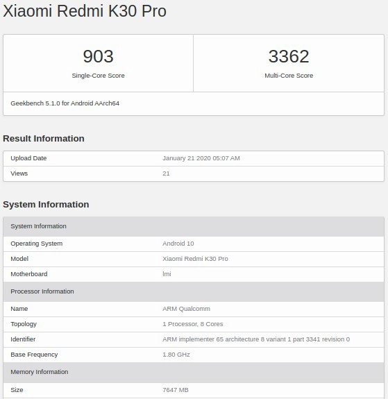 Πιο συγκεκριμένα, η λίστα από την διάσημη benchmarking πλατφόρμα, αποκαλύπτει το Redmi K30 Pro με τον Snapdragon 865 ωστόσο τα αποτελέσματα δεν είναι αυτά που αρμόζουν σε ένα SoC αυτού του επιπέδου. Αυτό πιθανόν συμβαίνει λόγω του χρονισμού ο οποίος έχει μειωθεί στα 1.8GHz. Ταυτόχρονα, αποκαλύπτεται ότι το Redmi K30 Pro θα έχει μνήμη RAM η οποία θα ανέρχεται στα 8GB ενώ το παρόν θα δίνει και το MIUI 11 βασισμένο στο Android 10.