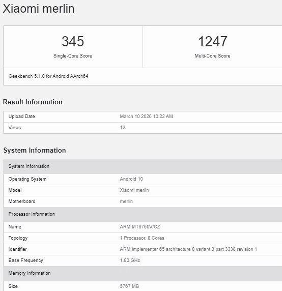 Το Redmi Note 9 αναμένεται να κυκλοφορήσει από την Xiaomi στις 12 Μαρτίου στην Ινδία, σήμερα όμως εντοπίστηκε στο Geekbench μία καταχώρηση για ένα smartphone με την κωδική ονομασία Xiaomi merlin. Το τηλέφωνο τρέχει το Android 10, ενσωματώνει το chipset ARM MT6769V/CZ ενώ η μνήμη RAM ανέρχεται στα 6GB.
