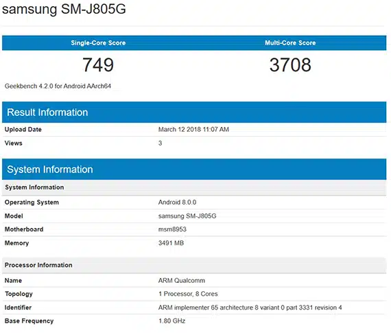 Το νέο μέλος της σειράς J από τη Samsung με τον κωδικό SM-J805G φαίνεται πως ανήκει στο Galaxy J8 Plus και έκανε το πέρασμά του από την πλατφόρμα του Geekbench με σκορ το οποίο είναι μεν απλά καλό, με 749 πόντους στο single-core και 3708 πόντους στο multi-core test, αλλά βλέπουμε ότι η συσκευή διαθέτει τεχνικά χαρακτηριστικά τα οποία μπορεί να είναι mid-range αλλά δε θα αφήσουν τους χρήστες ανικανοποίητους.