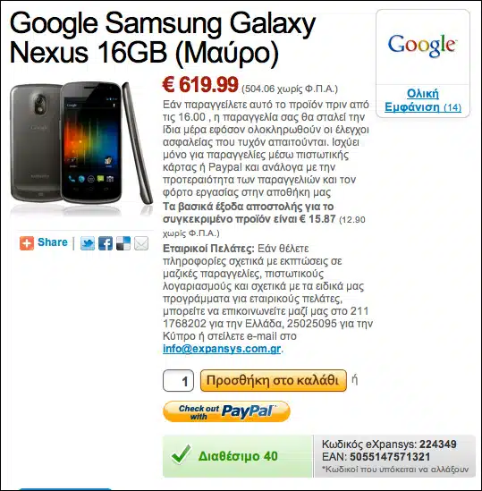 Αν είστε από τους βιαστικούς και δεν μπορείτε να περιμένετε μερικές ημέρες ακόμα την επίσημη κυκλοφορία του Samsung Galaxy Nexus στη χώρα μας (πρώτο 15νθήμερο Δεκεμβρίου μας έχουν ενημερώσει), το ηλεκτρονικό κατάστημα Expansys έχει σε στοκ το μοντέλο με τα 16GB ενσωματωμένης μνήμης και σε τιμή 620 ευρώ (+ 15.87 ευρώ μεταφορικά).